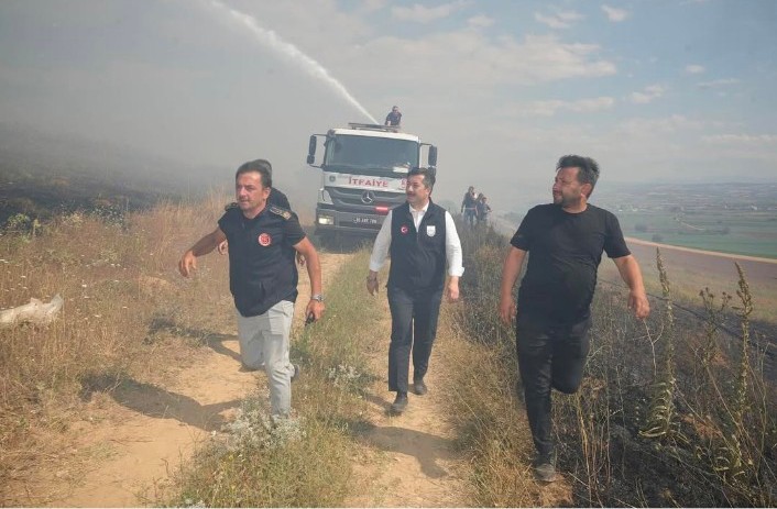 İtfaiye aracı yangının ekili alanlara yayılmasını önlemek için tarla yolundan ilerlerken, Yenişehir Belediye Başkanı Ercan Özel’le Cihadiye Muhtarı Ayhan Özdemir de itfaiye aracının önünde koştular.