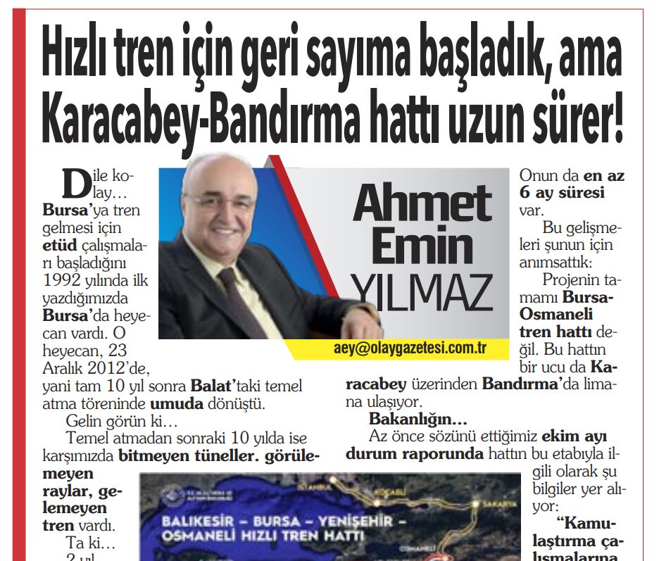 5 Kasım’da… “Hızlı tren için geri sayıma başladık, ama Karacabey-Bandırma hattı uzun sürer” başlığı altında, Ulaştırma Bakanlığı’ndaki aylık durum raporunu aktardık.