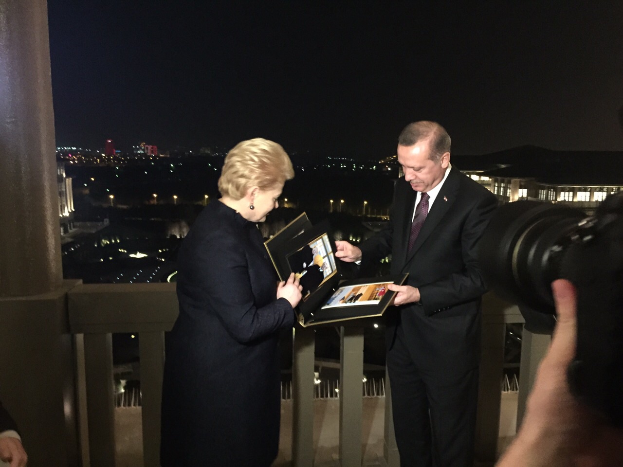 Büyük salondaki yemeğin ardından, arka planda gece Ankara manzarasının yer aldığı terasa çıkıldı ve burada iki cumhurbaşkanı birbirlerine armağanlar verdiler.