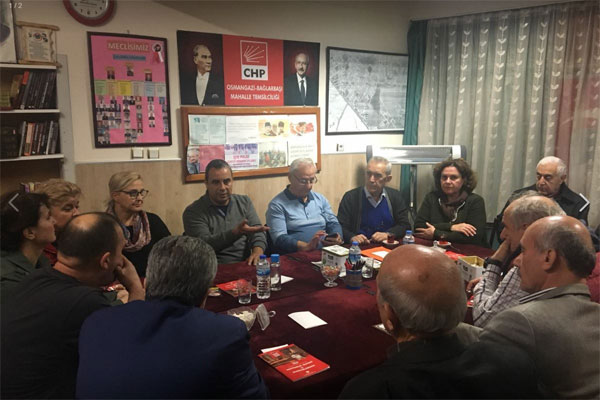 İl Başkanı Mehmet Alanbel, İl Sekreteri ve MKK Üyesi Semra Yılmaz, Öncü Kadın İl Başkanı Sema Kırmız ve Öncü Kadın İl Sekreteri Nermin Körmükçü ile sohbet ederken, 19 Kasım Pazar günü “Vatan savaşından milli hükümete” temasıyla Altınceylan’da dayanışma yemeği düzenlendiğini söylediler.
