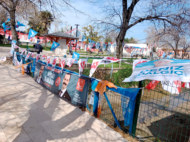 Gördüğümüz en renkli yer Mudanya Güzelyalı’daki Atatürk Parkı oldu. Bazı afiş ve pankartlar üst üste asılmış olsa da, Demokrasi Meydanı görünümüne bürünen Güzelyalı Atatürk Parkı’ndaki hava kent merkezinde yok.