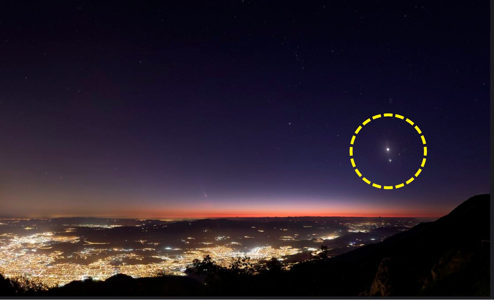 Gökyüzünde Neowise Kuyruklu Yıldızı yükselirken, bir yandan Ay ve Venüs yan yana gelmiş.