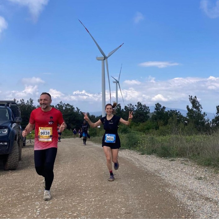 Yıllardır antrenman için koştuğu Gündoğdu’da bu kez yarıştı. Tepedeki rüzgar enerjisi santrallerinden deniz kıyısına indi, tekrar muhteşem manzaralı tepeye tırmandı.