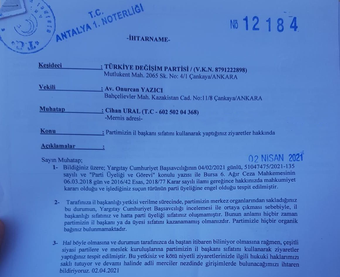 Bursa’daki yapılanma TDP Genel Merkezi’ni de pek memnun etmemiş ki, Bursa İl Başkanı Cihan Ural ve yönetimi için verilen görevden alma kararı Noter aracılığıyla tebliğ edilmiş.