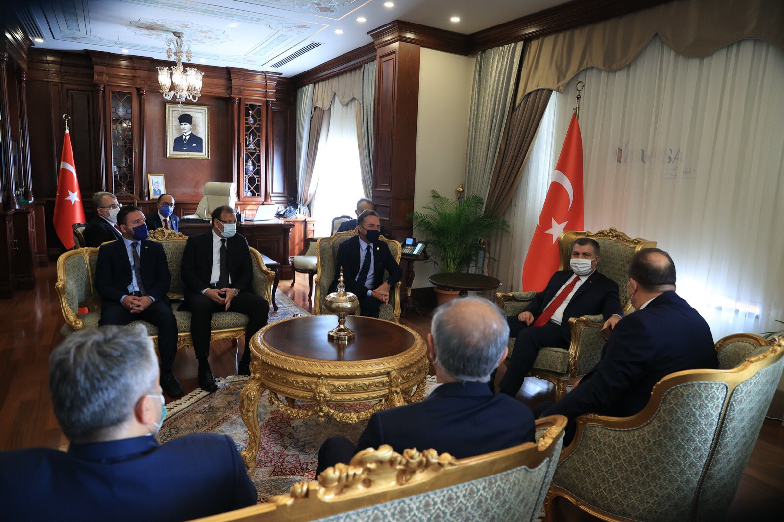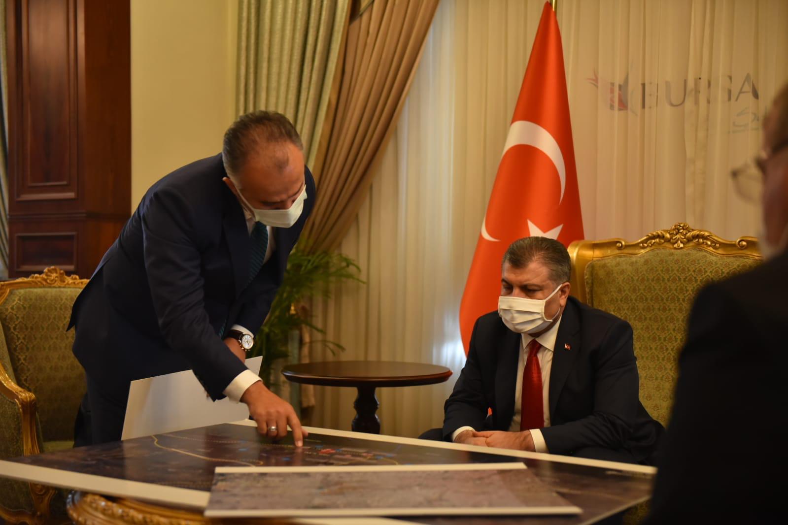 Bursa’daki sağlık yatırımlarıyla ilgili değerlendirmeler yaparken, Bursa Valiliği’ndeki öğleden önce temaslarında Büyükşehir Belediye Başkanı Alinur Aktaş’tan Şehir Hastanesi çevresindeki düzenlemeler hakkında bilgi aldı.