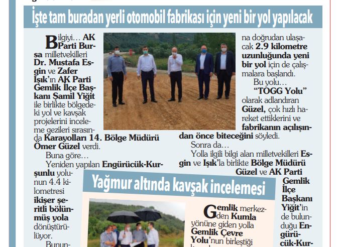 Bu sütunlarda… 14 Temmuz günü duyurduk. Gemlik-Mudanya Sahil Yolu kapsamında Engürücük-Kurşunlu arasındaki 4.4 kilometrelik bölüm TOGG fabrikası nedeniyle duble yol olarak yapılıyor.