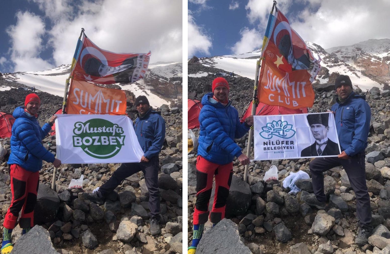 Türk Bayrağı’nı 5 bin 137 metrede zirveye diken Topkül, üzerinde Atatürk posteri ve Nilüfer Belediyesi logosu bulunan bayrakla poz verdi.