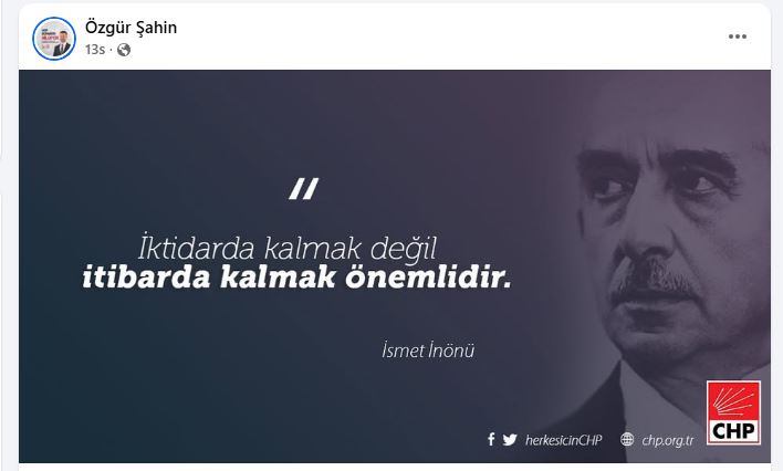 CHP Nilüfer İlçe Başkanı Özgür Şahin’den, 2. Cumhurbaşkanı ve CHP’nin kurucusu İsmet İnönü’nün bir sözünün paylaşımı geldi: