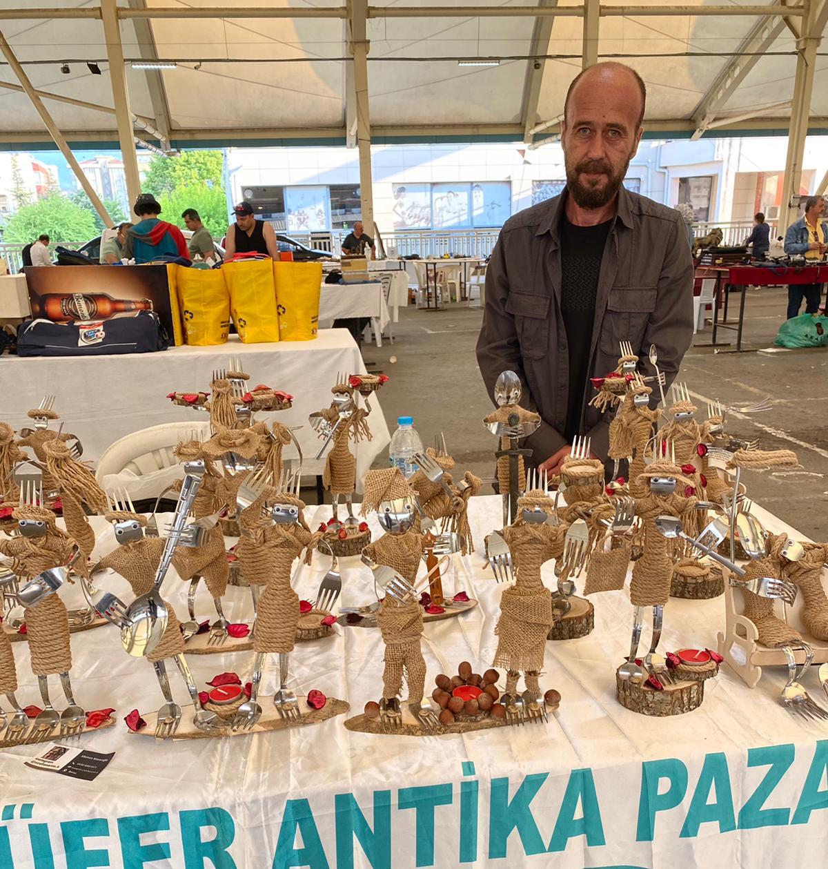 Bir fabrikada çalışan Mümin Köseoğlu’nun yaptığı atıklardan kaşık çatallarla heykeller de çok ilgi görüyor.