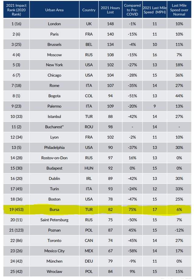 2021 yılında dünyada en çok trafik sıkışıklığı yaşanan ilk 25 şehir arasında Bursa 19. sırada yer alıyor. 2020’deki yerimiz ise dünyada 453. sıra görülüyor.