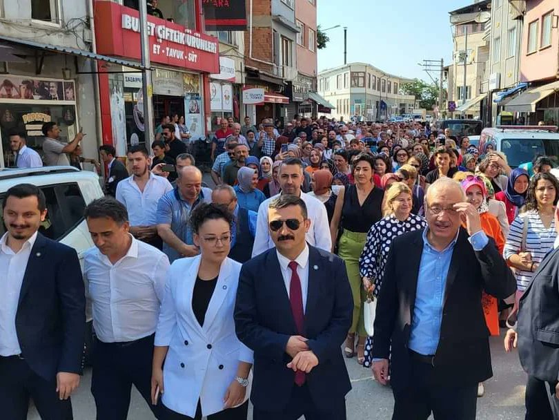 Bursa Milletvekili ve Grup Başkanı Prof. Dr. İsmail Tatlıoğlu var. Yanında GİK Üyesi Müberra Çakır ve İYİ Parti İl Başkanı Selçuk Türkoğlu yürüyorlar.