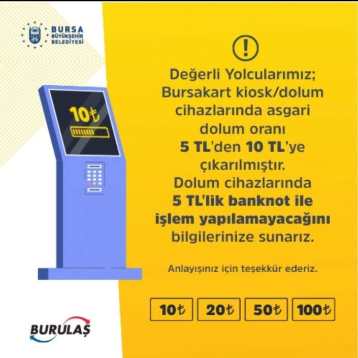 Büyükşehir Belediyesi kuruluşu BURULAŞ da geçti. O da artık 10 lira ve katlarıyla dolum yapıyor, 5 lira kabul etmiyor.
