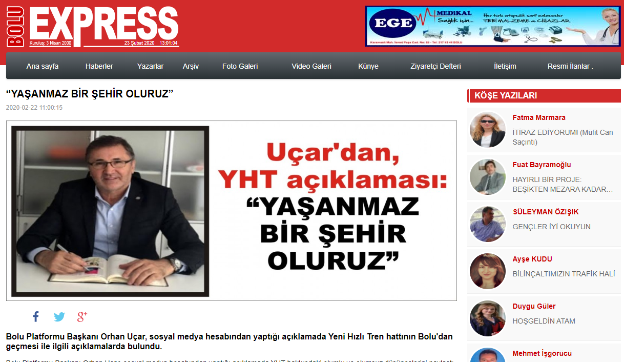 Bolu yerel gazetelerinde dikkatimizi çeken açıklamayı, “yüksek hızlı treni Bolu’ya getirmek” amacıyla oluşturulan Bolu Platformu Başkanı Orhan Uçar yapmış.