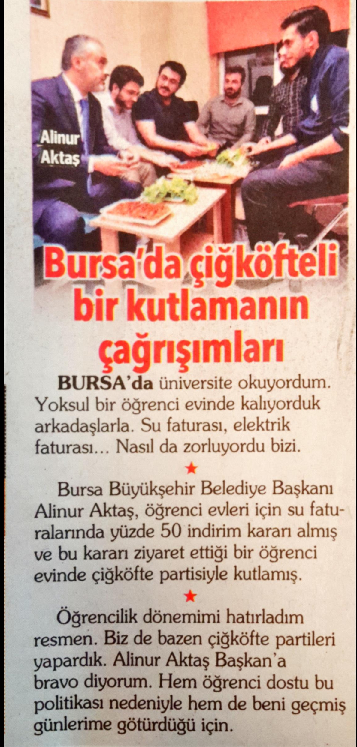 Hakan, dünkü köşe yazısında Büyükşehir Belediye Başkanı Alinur Aktaş’ın öğrenci evlerine su indirimi jestini öğrenci dostu olarak yorumlayıp kendi öğrencilik yılları anılarıyla kutladı.