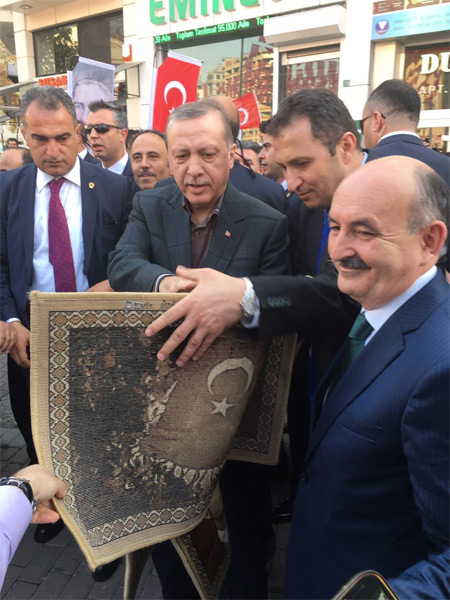 Halılardan birinde Erdoğan’ın çok sevdiği ve 15 Temmuz gecesi yaşamını yitiren Erol Olçak ile oğlu Abdullah Tayyip Olçak’ın resimleri, diğerinde de yine 15 Temmuz gecesi yaşamını yitiren Erdoğan’ın danışmanı Mustafa Varank’ın ağabeyi Prof. Dr. İlhan Varank’ın resmi işlenmişti.