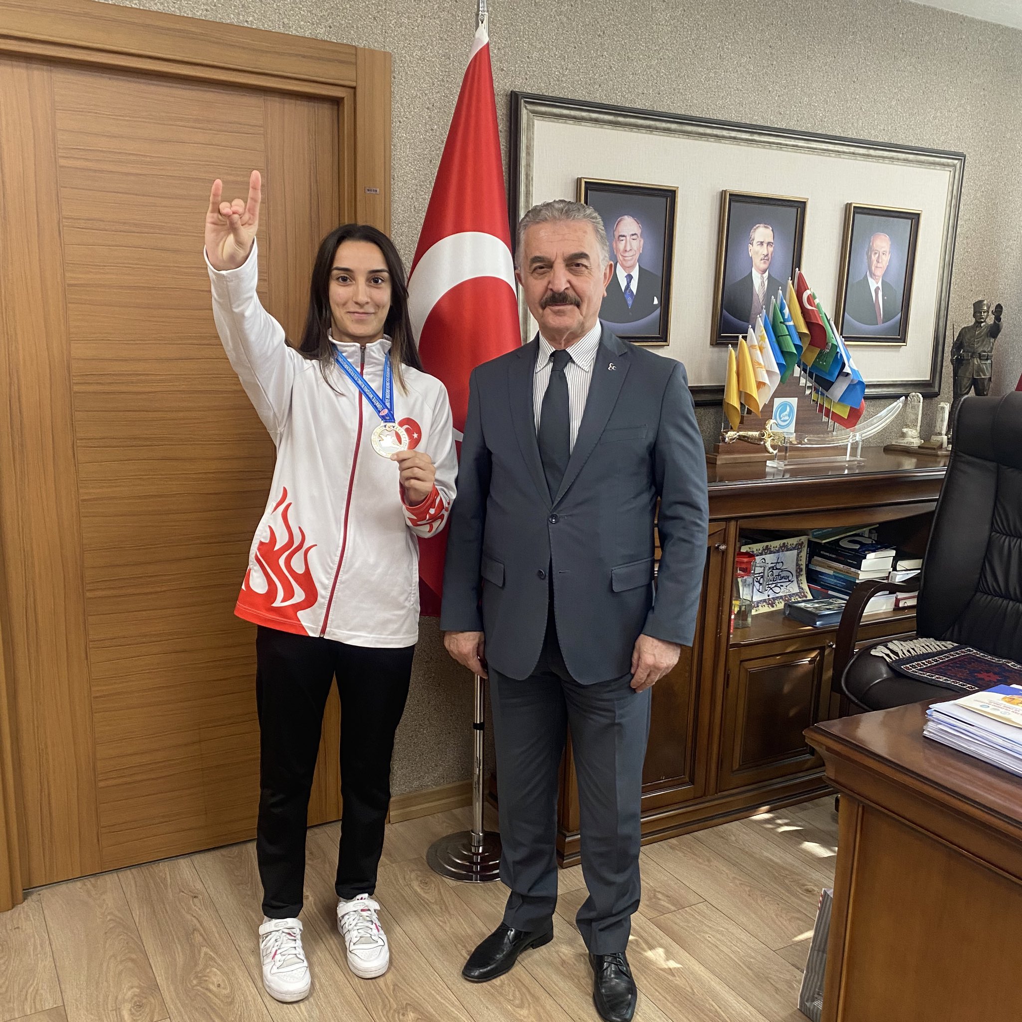 Şampiyona hakkında bilgi verip madalyasının öyküsünü anlatan Sıla Zeynep, ayrıca Büyükataman’ın yanında Bozkurt işareti yaptı. Büyükataman da genç sporcuyu kutlarken, “Bozkurt duruşuyla göğsümüzü kabartan kıymetli evladımızın başarılarını devamını diliyorum” dedi