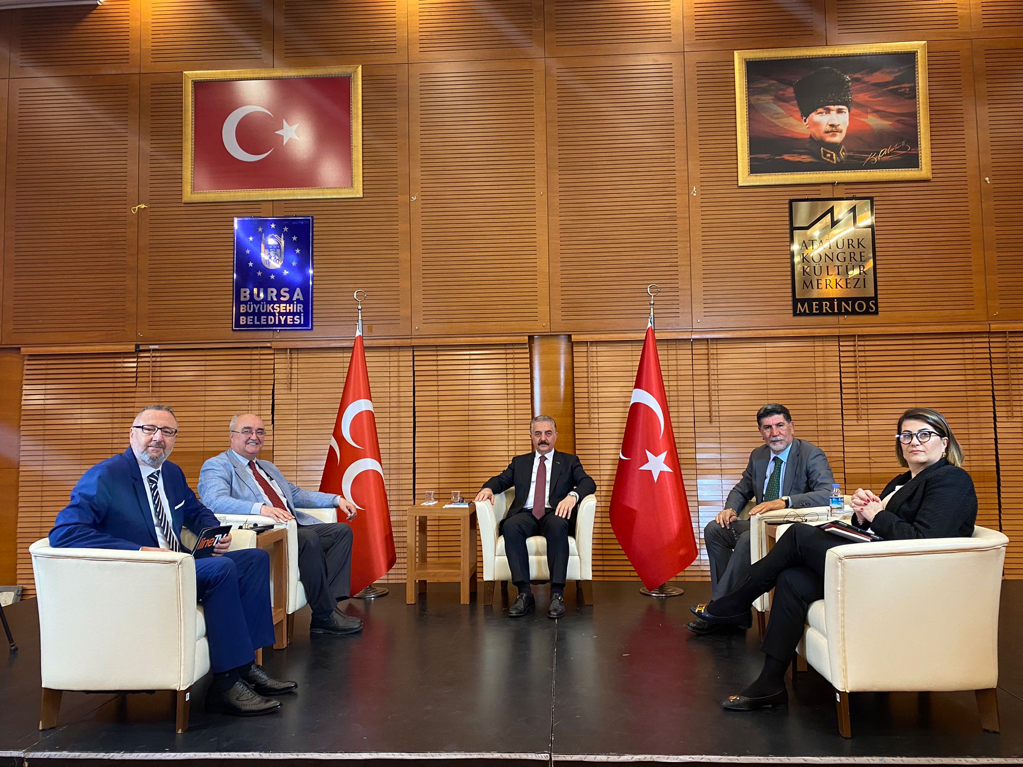 Buluşma MHP İl Başkanlığı’nda olacaktı, fakat format büyüyünce ve televizyon çekimi de girince Merinos’a alındı. Biz de Bursa Hakimiyet Başyazarı Namık Göz, Lider TV Programcısı Neslihan Çelik Alkoçlar, Line TV Programcısı Ersel Peker meslektaşlarımızla MHP Genel Sekreteri İsmet Büyükataman’a sorular yönelttik.