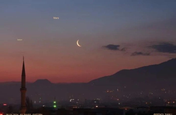 Güzel bir bahar gecesinin sabahında; Bursa’nın üstünde Ay, Mars ve Satürn’ün aynı hizaya geldikleri görülüyor.