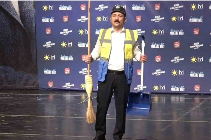 Cuma akşamı İYİ Parti Genel Başkanı Meral Akşener’in gelip Bursa adaylarını açıkladığı toplantıda sahneye belediye temizlik işçisi giysisi ve elinde süpürgeyle çıktı.