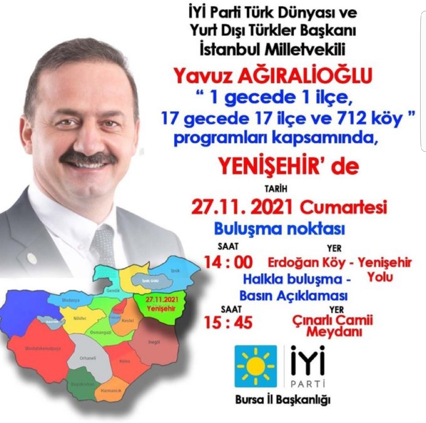 Televizyonlardan tanınan Ağıralioğlu, bir süredir İYİ Parti İl Başkanlığı tarafından sürdürülen “1 Gecede 1 İlçe” etkinliği için 27 Kasım Cumartesi günü Yenişehir’e geliyor.