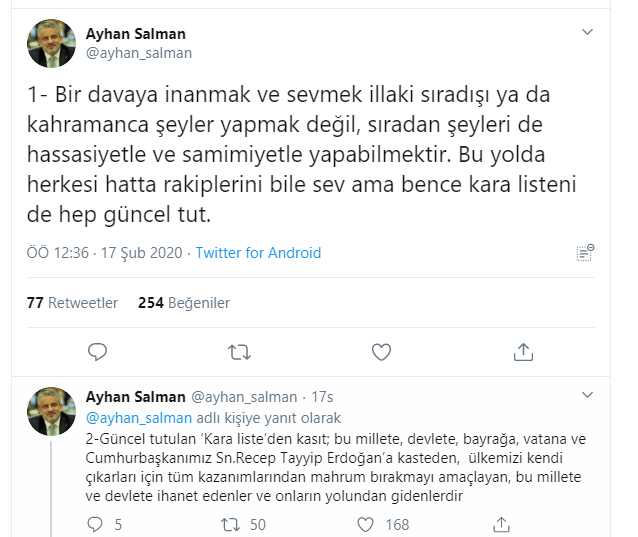 “Güncel tutulan kara listeden kasıt; bu millete, devlete, bayrağa, vatana ve Cumhurbaşkanımız Sn. Recep Tayyip Erdoğan’a kasteden, ülkemizi kendi çıkarları için tüm kazanımlarından mahrum bırakmayı amaçlayan, bu millete ve devlete ihanet edenler ve onların yolunda gidenlerdir.”