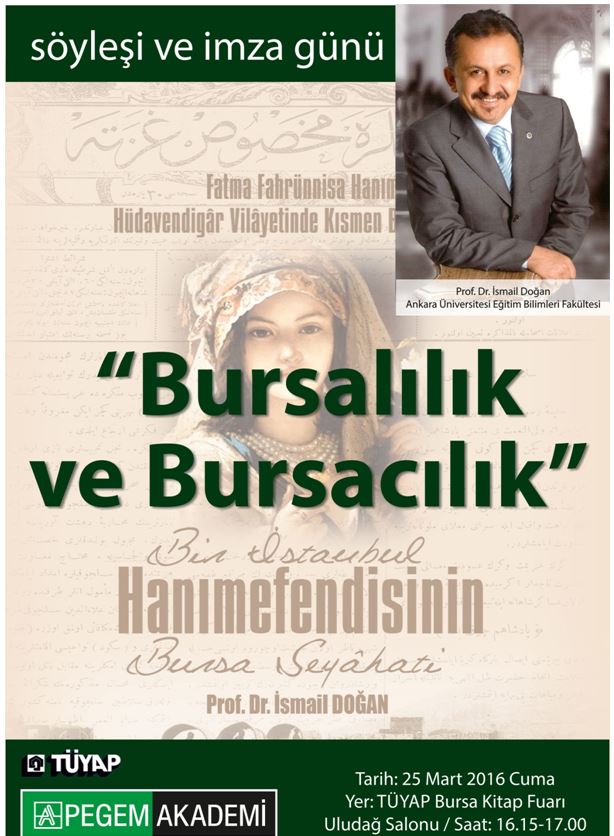 Kitabını Bursalılık ve Bursacılık olarak tanımlayan Prof. Dr. İsmail Doğan’ın katılacağı imza etkinliği bugün saat 16.00-17.00 arası Buttim’deki Tüyap Bursa Kitap Fuarı’nda.