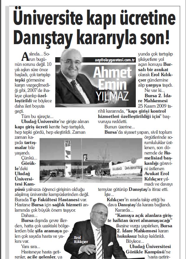 Davayı Avukat Erol Kılıkçıer açtı. Uludağ Üniversitesi’ne girişte alınan ve daha çok Tıp Fakültesi Hastanesi’ne gelenlerin tepkisine yol açan ücretin kaldırılması isteğini 2009 yılında Bursa 2. İdare Mahkemesi reddetti. Karar Danıştay’da “Kamuya açık alanlara giriş ücreti alınamayacağı” vurgusuyla bozuldu.