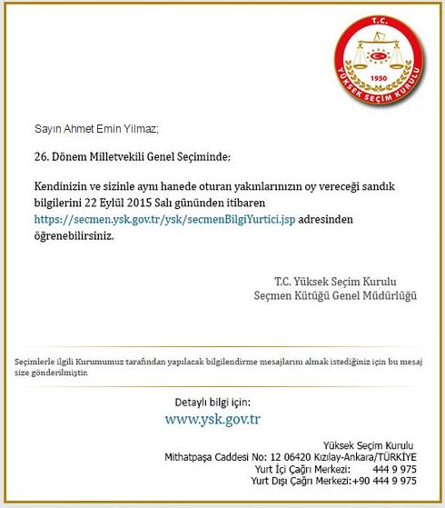 Doğrudan adımıza gönderilen iletide, “26. Dönem Milletvekili Genel Seçiminde kendinizin ve sizinle aynı hanede oturan yakınlarınızın oy vereceği sandık bilgilerini 22 Eylül 2015 Salı gününden itibaren öğrenebilirsiniz” denilerek verilen adrese tıklayınca sorgulama yapılabiliyor.