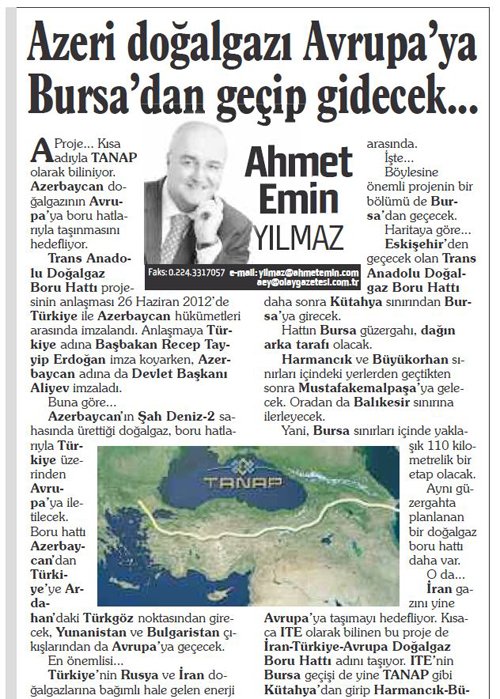 Televizyonda… Azerbaycan doğalgazını Avrupa’ya taşıyacak boru hattının temel atma törenini izlerken 25 Şubat 2013 günü bu sütunlarda duyurduğumuz projeyi anımsadık.