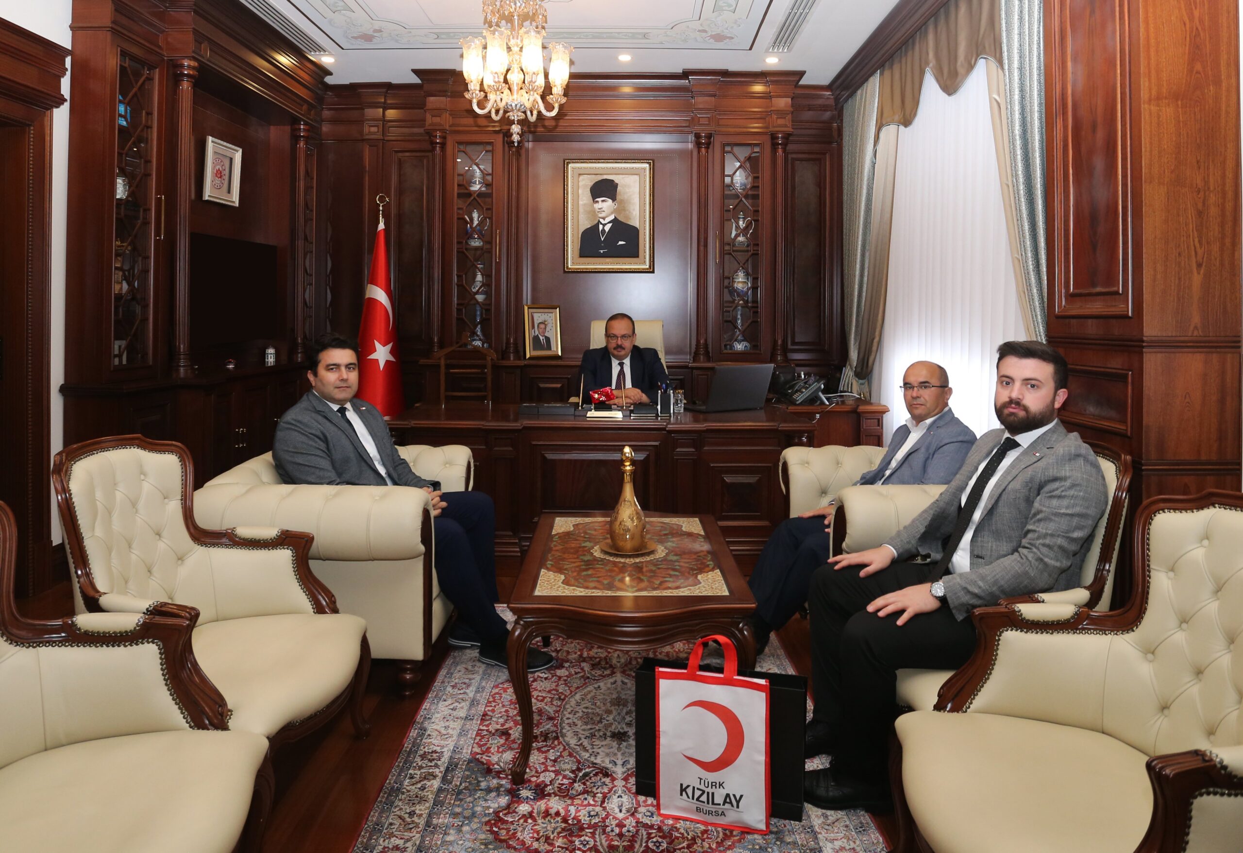- yılını kutlayan Türk Kızılay Bursa Şubesi Başkanı Prof. Dr. Murat Tutanç ve Yönetim Kurulu Üyesi Osman Nuri Koçdemir ile Mali ve Destek Hizmetleri Yöneticisi Semih Aksoy ziyaret ettikleri Bursa Valisi Yakup Canbolat’ı çalışmalarla ilgili bilgilendirdiler.