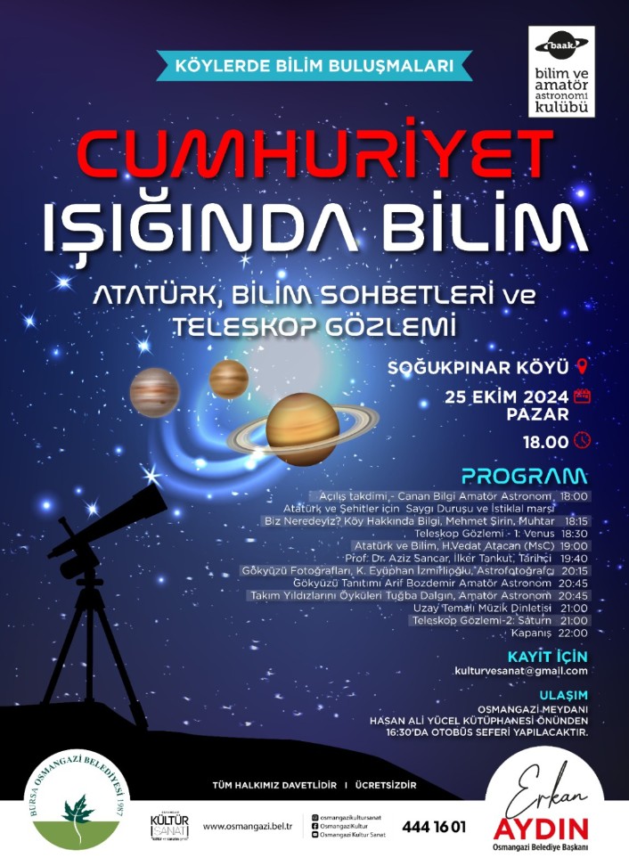 Köylerde Bilim Buluşmaları adıyla Soğukpınar’da gerçekleştirilecek Cumhuriyet Işığında Bilim etkinliği, teleskop gözlemine de sahne olacak.