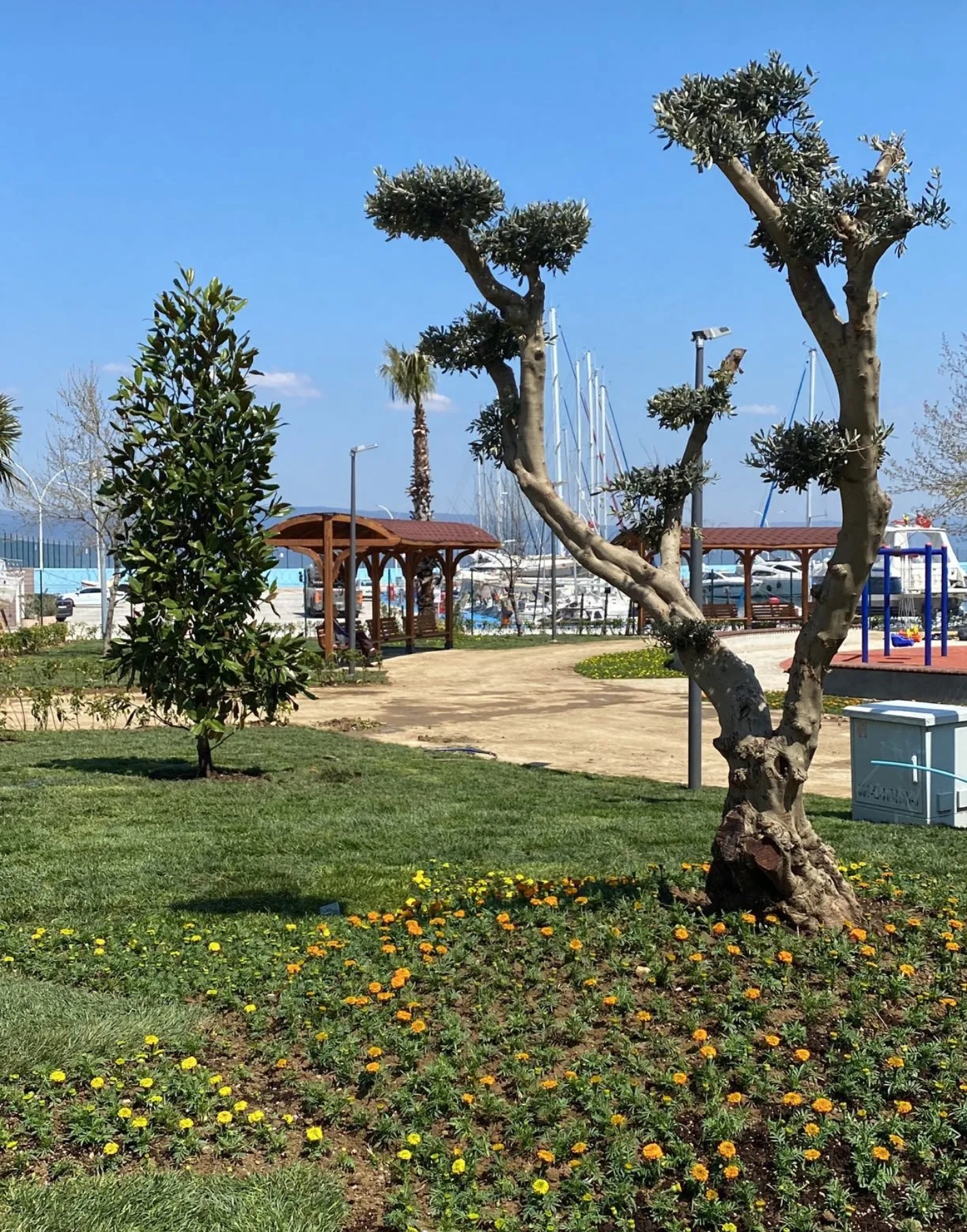 Yeşillik ve çiçeklele renklenen ve modern oturma gruplarının yer aldığı parkta yan yana iki ağaç dikkat çekiyor.