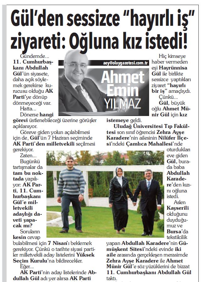 Pazar günü… 11. Cumhurbaşkanı Abdullah Gül’ün eşi Hayrünnisa Gül ile birlikte büyük oğulları Ahmet Münir Gül’e kız istemek için Bursa’ya geldiklerini, aslen Kayserili olan tekstilci Abdullah Karadere’nin Nilüfer Gümüşkent Sitesi’ndeki evinde Tıp Fakültesi son sınıf öğrencisi Zehra Ayşe Karadere ile söz yüzüklerini taktıklarını yazıp gazeteye gönderdikten sonra şöyle bir düşündük.