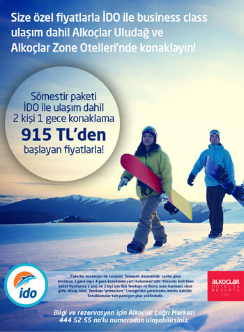 İstanbul’dan gelecek tatilciler, hızlı feribotta araç ve 2 kişi olarak busines class mevkide gidiş-dönüş yolculuğunun da içinde bulunduğu paket gereği, İDO’nun anlaşmalı olduğu Uludağ’daki iki otele iki kişi gecelik 915 lira ödeyecekler.