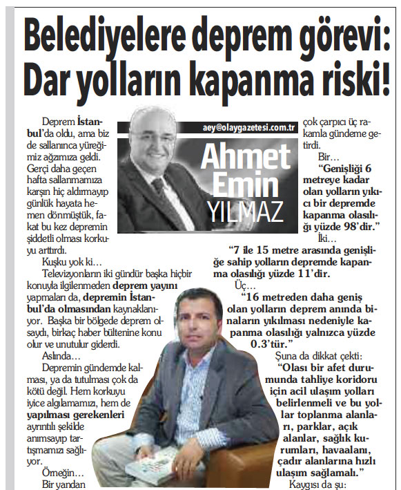 “Kobe depremi gösterdi ki, bir binanın yıkılması halinde araç geçebilmesini sağlayacak 3 metrelik genişlik için yolun en az 11-12 metre olması gerekir.”