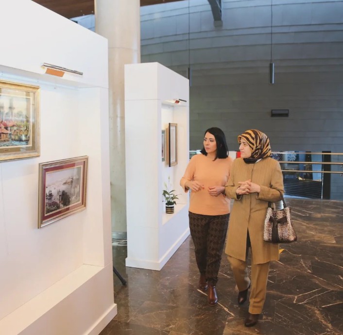 Vali Mahmut Demirtaş’ın eşi Beyhan Demirtaş da sergilenen eserleri gezerken, Elif Kamacı Efe’den bilgi aldı.