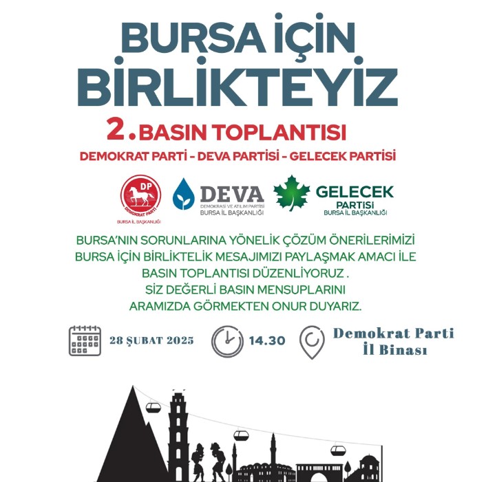 7 Ekim’de… Gelecek Partisi İl Başkanı Fuat Kadıoğlu, DEVA Partisi İl Başkanı Tayfun Öztürk, DP İl Başkanı Çağrı Kaplan’ın Bursa için Ortak Muhalefet yapmak üzere anlaştıklarını duyurduk.