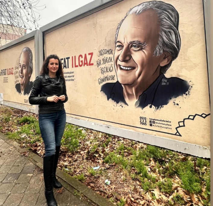 Kent caddelerini süsleyen çizimleri önünde Rıfat Ilgaz anısı pozu verdi.