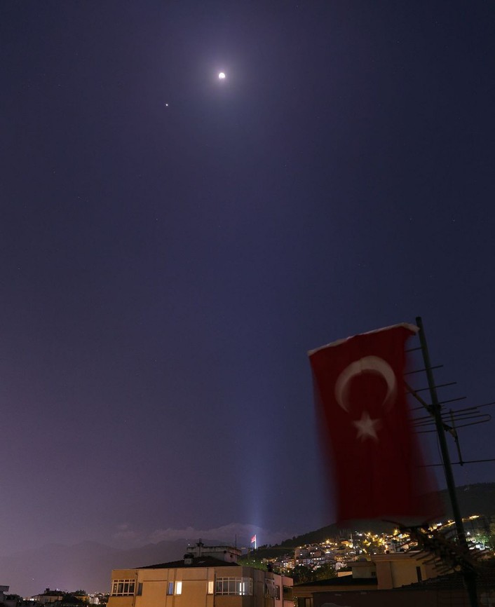 Çalışmalarını dünyanın izlediği Bursalı ödüllü gökyüzü fotoğrafçısı Tunç Tezel de, kent merkezinde yaşadığı evin terasından parçalı ay tutulmasını aynı gece Cumhuriyetin 100. yılı kutlamaları için asılan bayrakla birlikte görüntüledi.