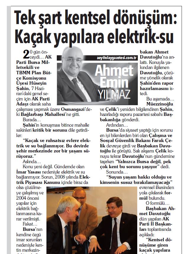 20 gün kadar önce Bağlarbaşı Mahallesi’nde kendisine iletilen elektrik ve su bağlanmayan kaçak yapılardaki zor yaşam sorununu Başbakan Ahmet Davutoğlu’nun gündemine taşıyıp açıklamaya dönüşmesini sağlayan AK Parti Bursa Milletvekili Hüseyin Şahin ve sorunun çözümüne katkı koyan herkese teşekkür var.