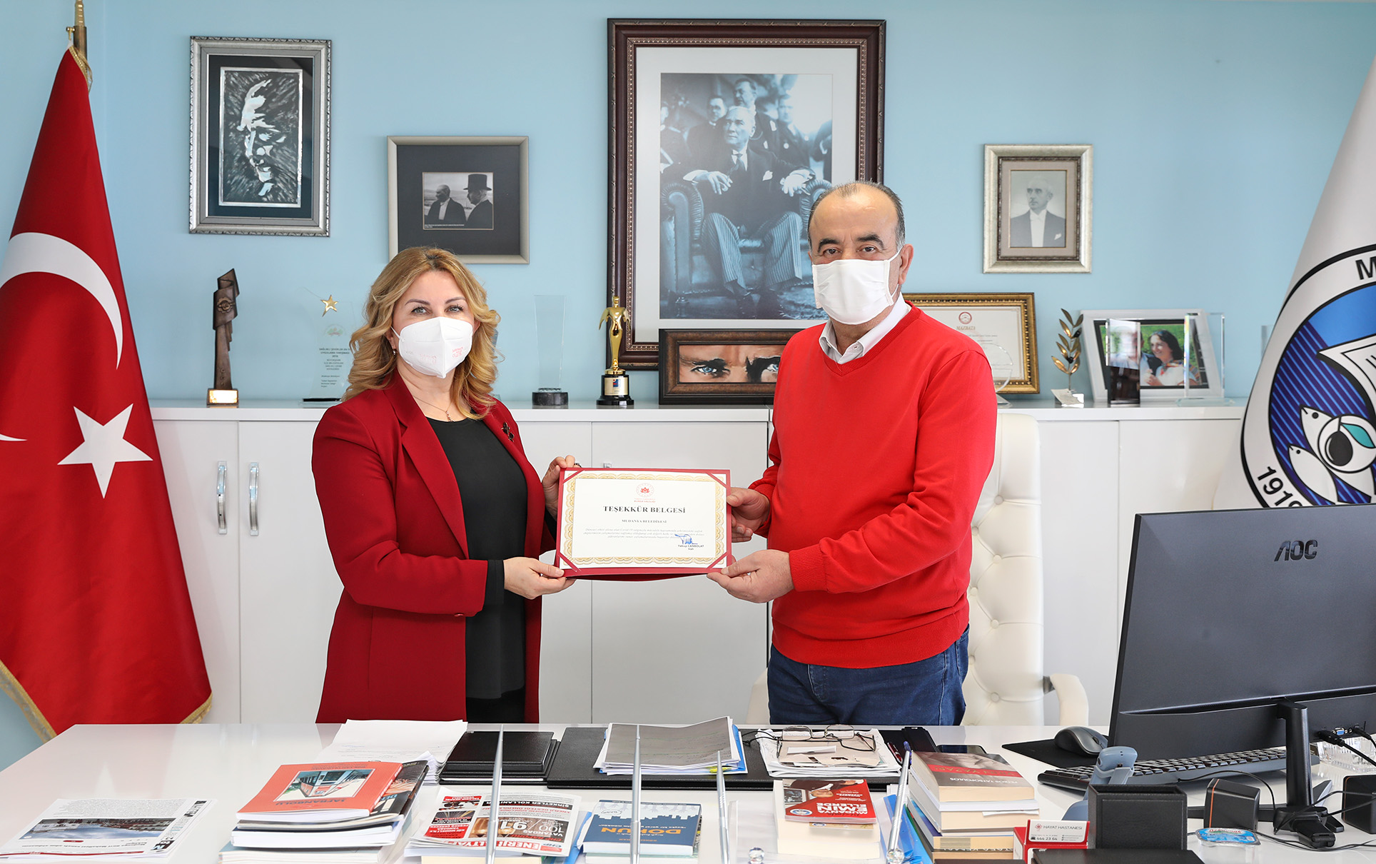 Mudanya İlçe Sağlık Müdürü Dr. Nalan Yıldız, filyasyon ekiplerine verdiği destek nedeniyle Mudanya Belediye Başkanı Hayri Türkyılmaz’a Vali Yakup Canbolat’ın teşekkür belgesini teslim etti.