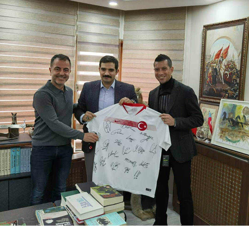 Bursalı olan Ülkü Ocakları eski Genel Başkanı Dr. Sinan Ateş’i ziyaret eden FİFA kokartlı hakemlerimiz Ali Palabıyık ve Serkan Olguncan bir de A Milli Futbol Takımı oyuncularının imzaladıkları ayyıldızlı forma armağan ettiler.