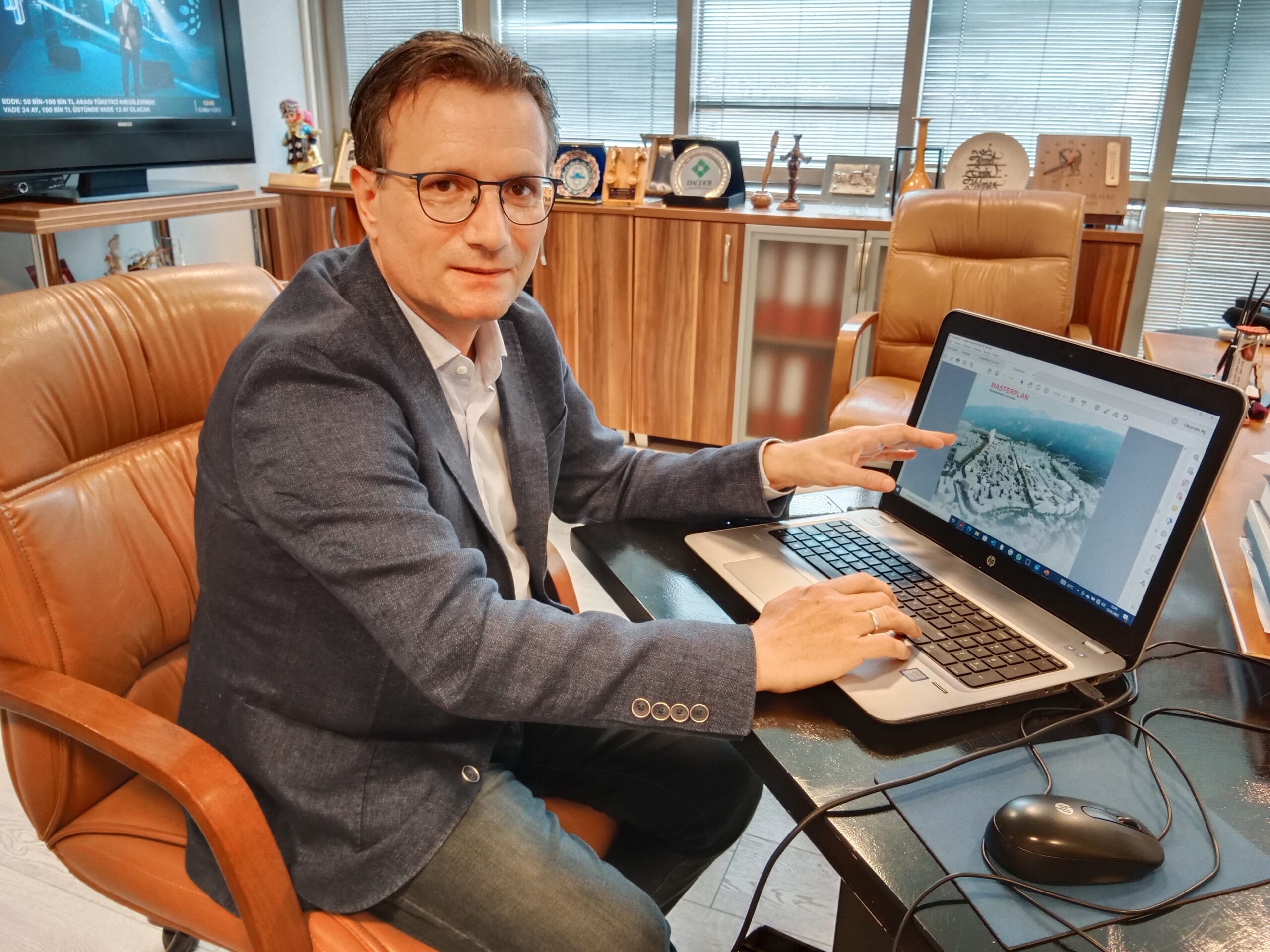 Bilgisayarını alıp geldi ve geçmişten bugüne Hanlar Bölgesi çalışmaları hakkında görseller üzerinde bilgiler verdi.