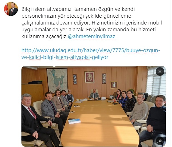 Prof. Dr. Kılavuz’un mesajında bir de fotoğraf var. O fotoğrafta, bilgim işlem altyapısıyla ilgili BUÜ’de yapılan toplantıyı gösteriyor.