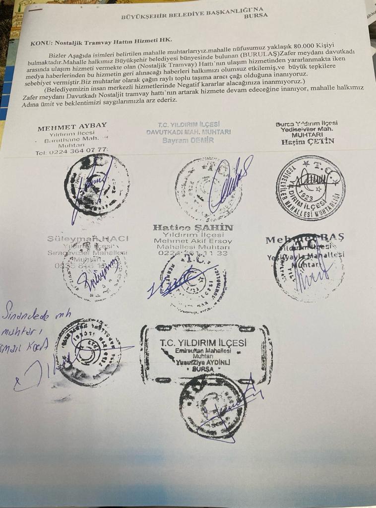 Dilekçede… Yıldırım ilçesi mahalleleri olan Baruthane Muhtarı Mehmet Aybay, Davutkadı Muhtarı Bayram Demir, Yediselviler Muhtarı Haşim Çetin, Sıracevizler Muhtarı Süleyman Hacı, Mehmet Akif Ersoy Muhtarı Hatice Şahin, Yeşilyayla Muhtarı Mehmet Baş, Sinandede Muhtarı İsmail Koca, Emirsultan Muhtarı Yusuf Ziya Aydınlı imzaları var.