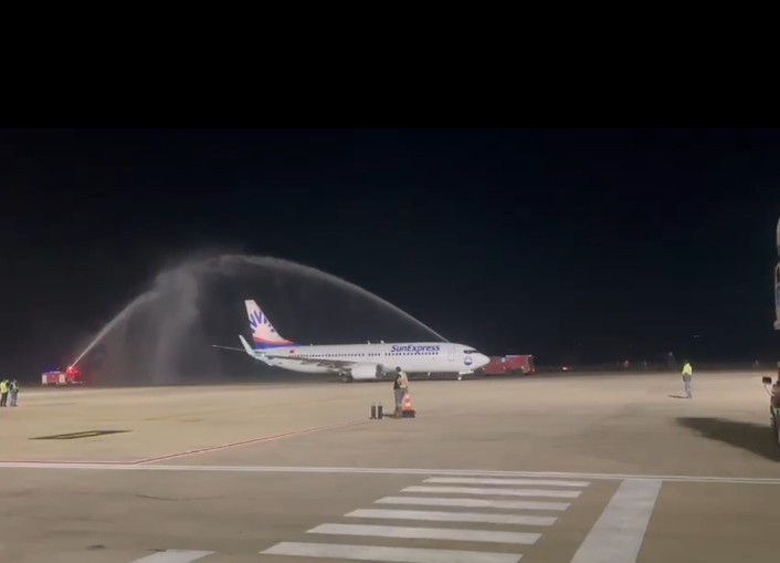 Antalya’dan gelen ilk uçak ve yolculara Yenişehir’de ‘su tüneli’ karşılaması