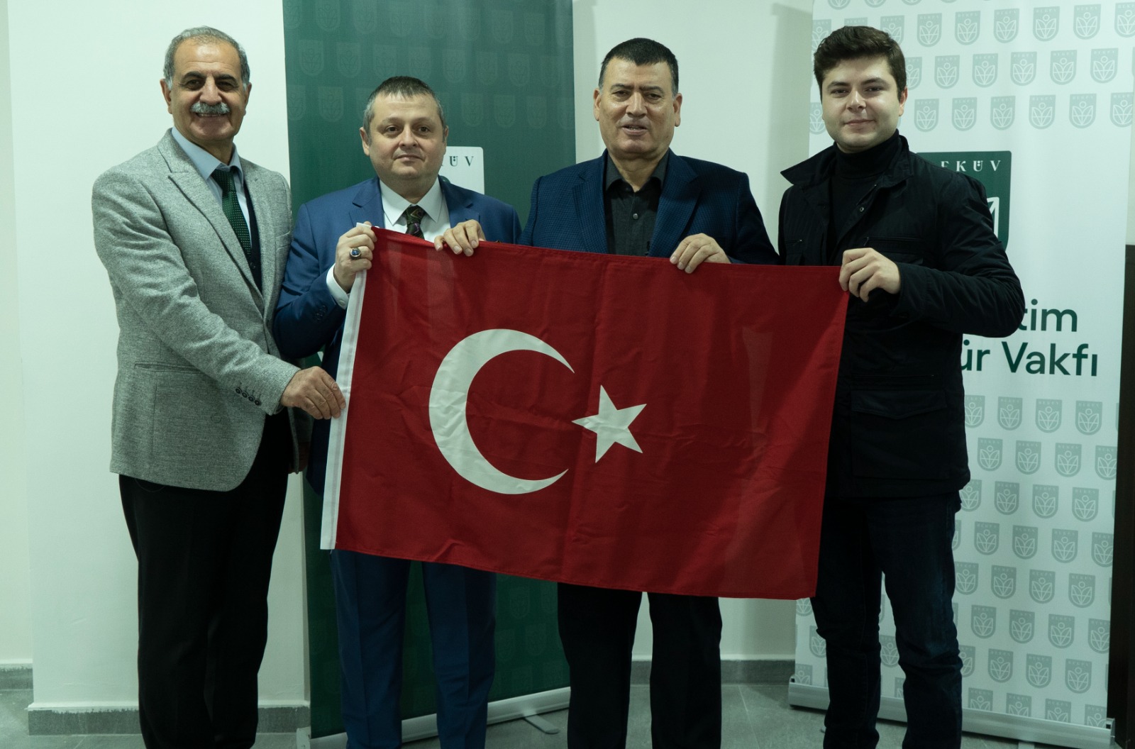 Mustafa Karaman’ın başkanı olduğu Kalite Birliği Derneği’nin Gençlik Kolları Başkanı Fatih Baykara, genç rektöre gençler adına Türk Bayrağı armağanını Milli Ses Ver Projesi kapsamında sundu.