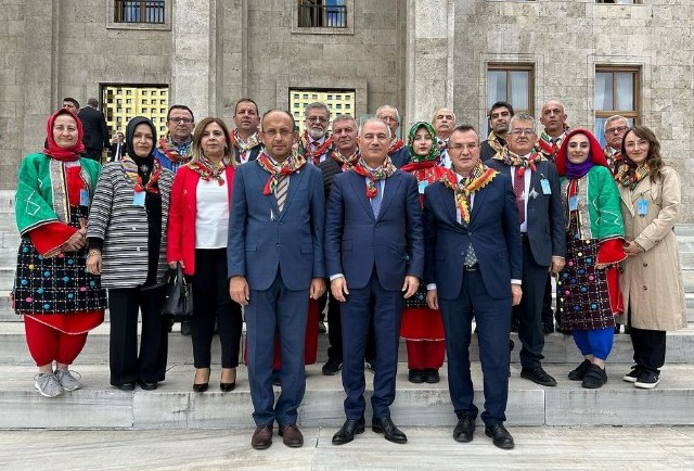 Başkan Dinçer Akyel ve yönetim kuruluyla, yörük giysili genç kızlar TBMM’ye renk getirdiler.