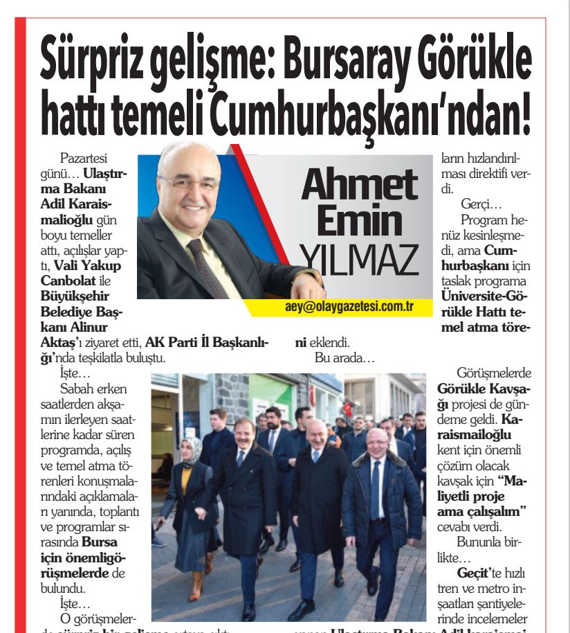 Cumhurbaşkanı Erdoğan’ın 21 Ocak Cumartesi günü gerçekleştireceği Bursa programında, iki hafta önce Ulaştırma ve Altyapı Yatırımları Bakanı Adil Karaismailoğlu’nun şifresini verdiği Bursaray’ı Uludağ Üniversitesi’nden Görükle’ye uzatacak hattın temelini atması bekleniyor.