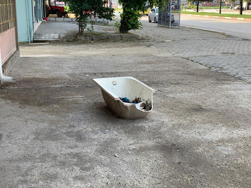 Kaldırımın orta yerinde kırık bir banyo küveti duruyor. Belli banyosundaki küveti yenileyen vatandaş, eskisini kaldırıp atmış.